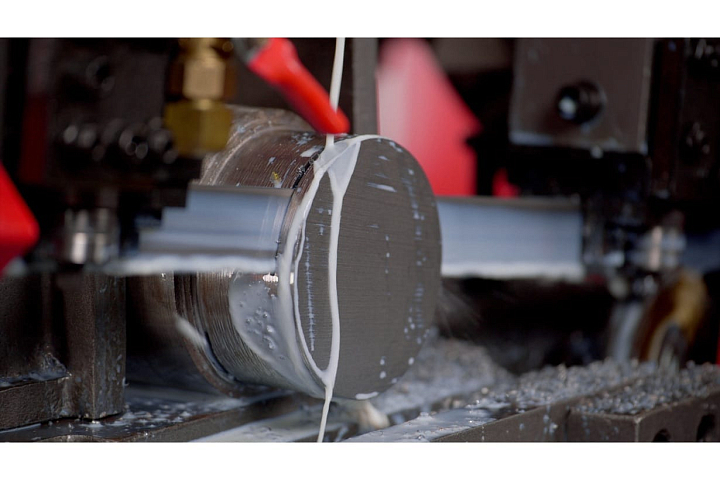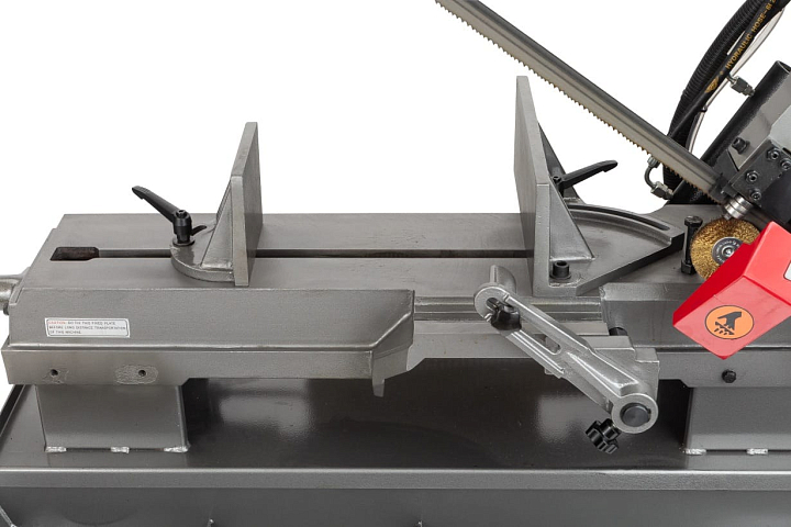 Процесс установки заготовок под нужным углом осуществляется за счет имеющихся механических тисков, оборудованных поворотными губками. Подъем и опускание тяжелой пильной рамы осуществляется за счет функционирования системы гидроразгрузки. С помощью гидроцилиндра можно осуществить регулировку скорости опускания консоли. Необходимое прижимное усилие рамы на обрабатываемую заготовку осуществляется за счет веса консоли.