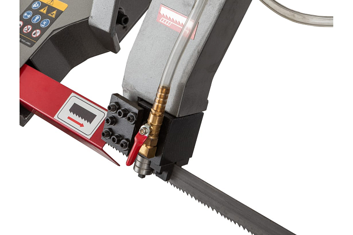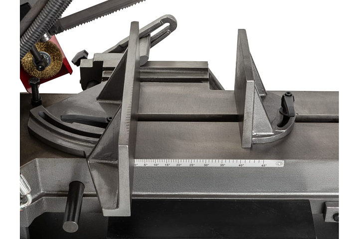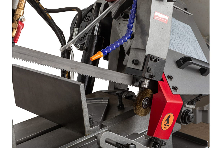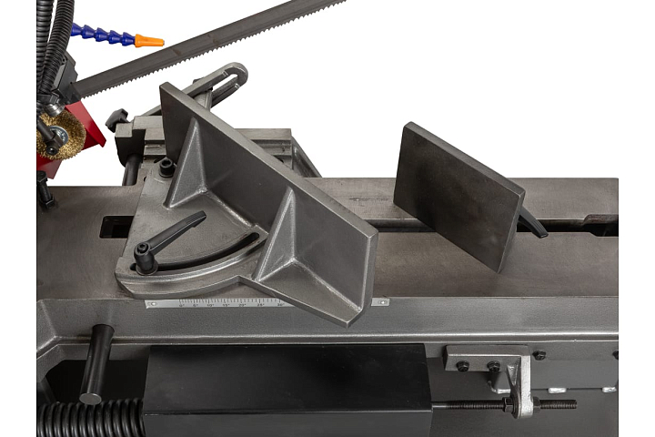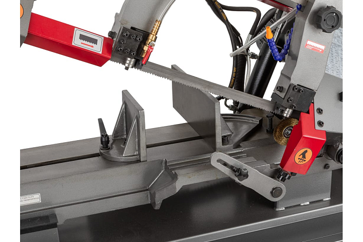 Процесс установки заготовок под нужным углом осуществляется за счет имеющихся механических тисков, оборудованных поворотными губками. Подъем и опускание тяжелой пильной рамы осуществляется за счет функционирования системы гидроразгрузки. С помощью гидроцилиндра можно осуществить регулировку скорости опускания консоли. Необходимое прижимное усилие рамы на обрабатываемую заготовку осуществляется за счет веса консоли.