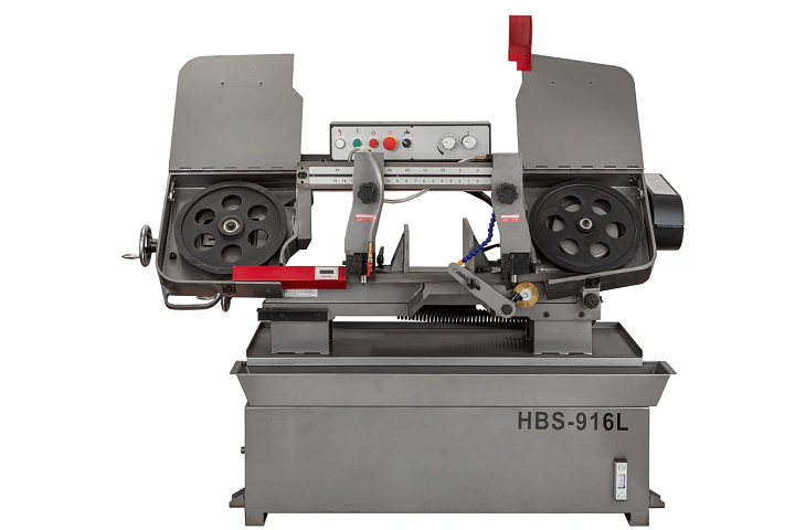 Модель HBS-916L имеет регулируемые направляющие, предназначенные для прохода ленточного полотна в зависимости от формы заготовки и ее диаметра. Наличие направляющих предотвращает возникновение вибрации полотна, уход полотна в сторону. Направляющие укомплектованы блоком подшипников и твердосплавными сухарями, осуществляющими позиционирование полотна непосредственно под прямым углом к поверхности обрабатываемой заготовки. Качество пиления обеспечивается подачей СОЖ в зону резания. Сила натяжения полотна обеспечивается поворотом маховика, установленного в левой, торцевой части консоли. Ленточнопильный станок оборудован поддоном для сбора стружки и отработанной жидкости. Вес станка в полном снаряжении составляет 300 кг.