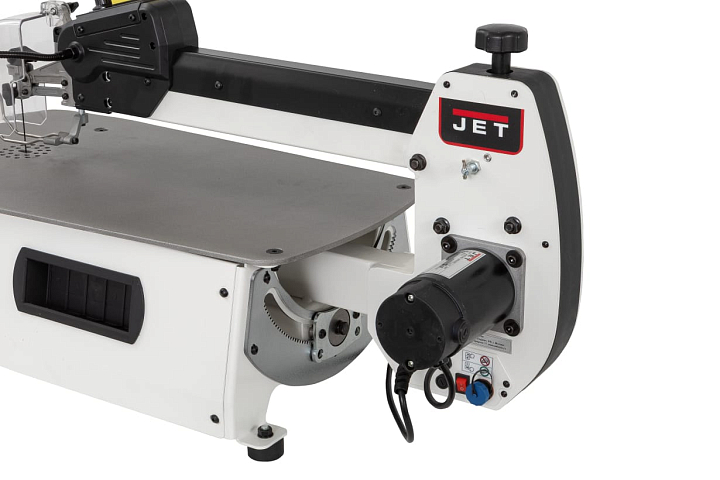 Что действительно важно для работы «целыми днями» и что самое главное - это то, что заготовки при пилении всегда располагаются на горизонтальном столе. Такой структуры нет у простеньких моделей. JSS от JET способен работать абсолютно без вибраций. При необходимости пилить под углами, наклон пилки происходит через наклон всего маятникового механизма. Для этого в подстолье с обеих сторон (фронтальной и тыльной) установлены стальные, зубчатые, направляющие полукольца. Весь механизм можно наклонить в любую из сторон вплоть до 30 в левую и до 45 в правую, просто используя для этого поворотную рукоятку. Движение пилки, верней частота хода, регулируется плавно для достижения оптимальной нагрузки и скорости пиления.