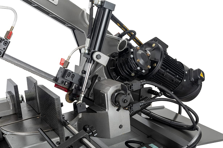 Инверторное управление двигателем позволяет поддерживать постоянную скорость движения полотна при изменении нагрузки. Скорость движения ленточного полотна регулируется потенциометром плавно в диапазоне от 0 до 80 м/мин, что позволяет пилить как трудно обрабатываемые, в т.ч. высоколегированные стали, так и легко обрабатываемые цветные сплавы, в т.ч. различные марки алюминия и получить самое высокое качество и производительность.